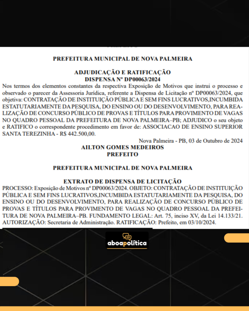 Prefeitura Municipal de Nova Palmeira, Seridó paraibano, oficializou no dia 3 de outubro de 2024 a contratação da Associação de Ensino Superior Santa Terezinha para a realização de um concurso público de provas e títulos, destinado ao preenchimento de vagas no quadro de pessoal do município. O valor do contrato é de R$ 442.500,00.
